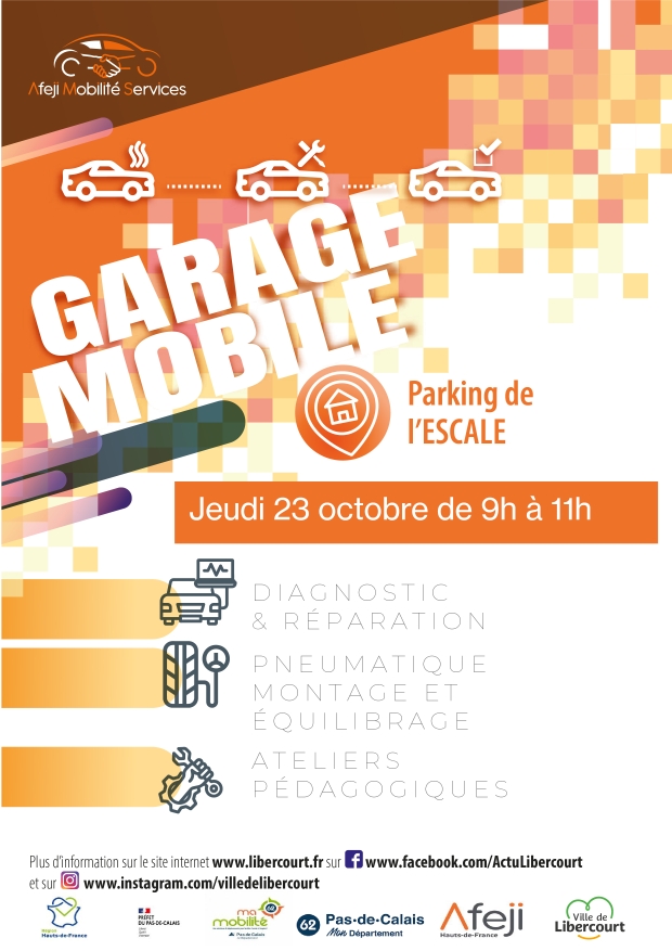 Le Garage Solidaire AFEJI arrive dans notre ville le 23 octobre de 9h à 11h sur le parking situé à l'arrière de l'ESCALE. Une gamme complète de services vous seront proposés comme diagnostic du véhicule ou encore des ateliers pédagogiques